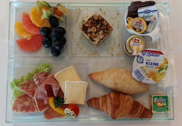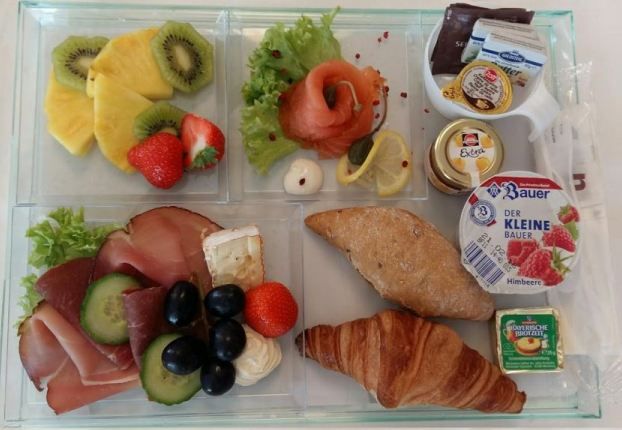 Salami Spianata & gekochter Schinken mit Havarti Käse & Bavaria Blu, Obstsalat der Saison