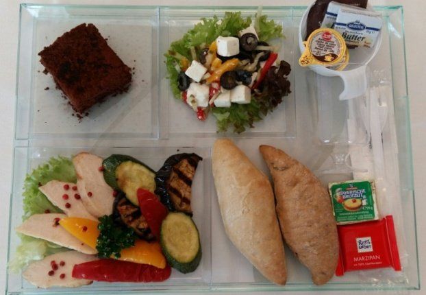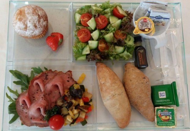 Blattsalat gemischt mit Gurken & Tomaten - Vanillemuffin - Roastbeef rosa gebraten auf Rucola mit Ratatouille Gemüse
